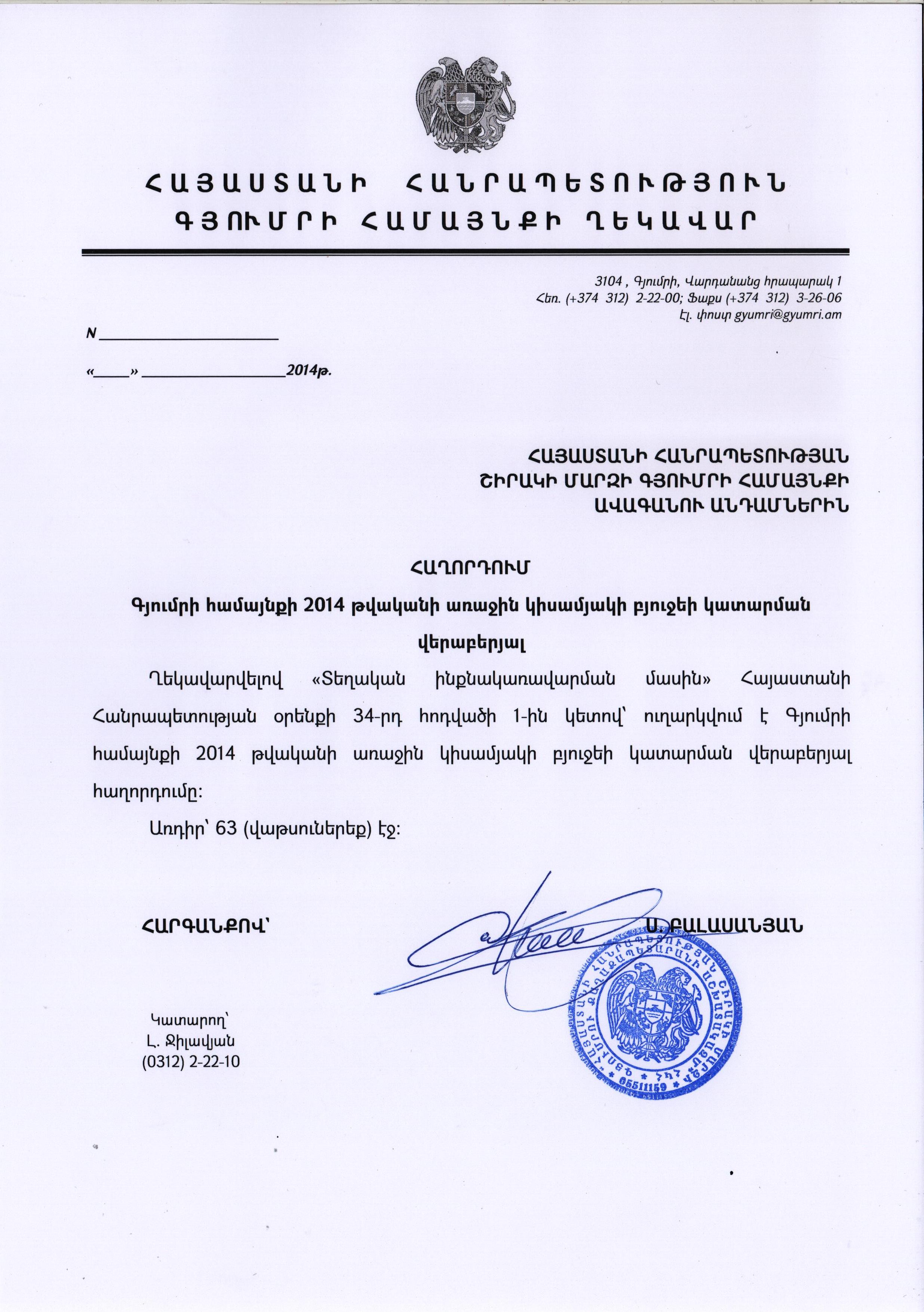 ՀԱՇՎԵՏՎՈՒԹՅՈՒՆ ԳՅՈՒՄՐԻ ՀԱՄԱՅՆՔԻ 2014 ԹՎԱԿԱՆԻ ԱՌԱՋԻՆ ԿԻՍԱՄՅԱԿԻ ԲՅՈՒՋԵԻ ԿԱՏԱՐՄԱՆ ՎԵՐԱԲԵՐՅԱԼ (ԱՌԴԻՐ)