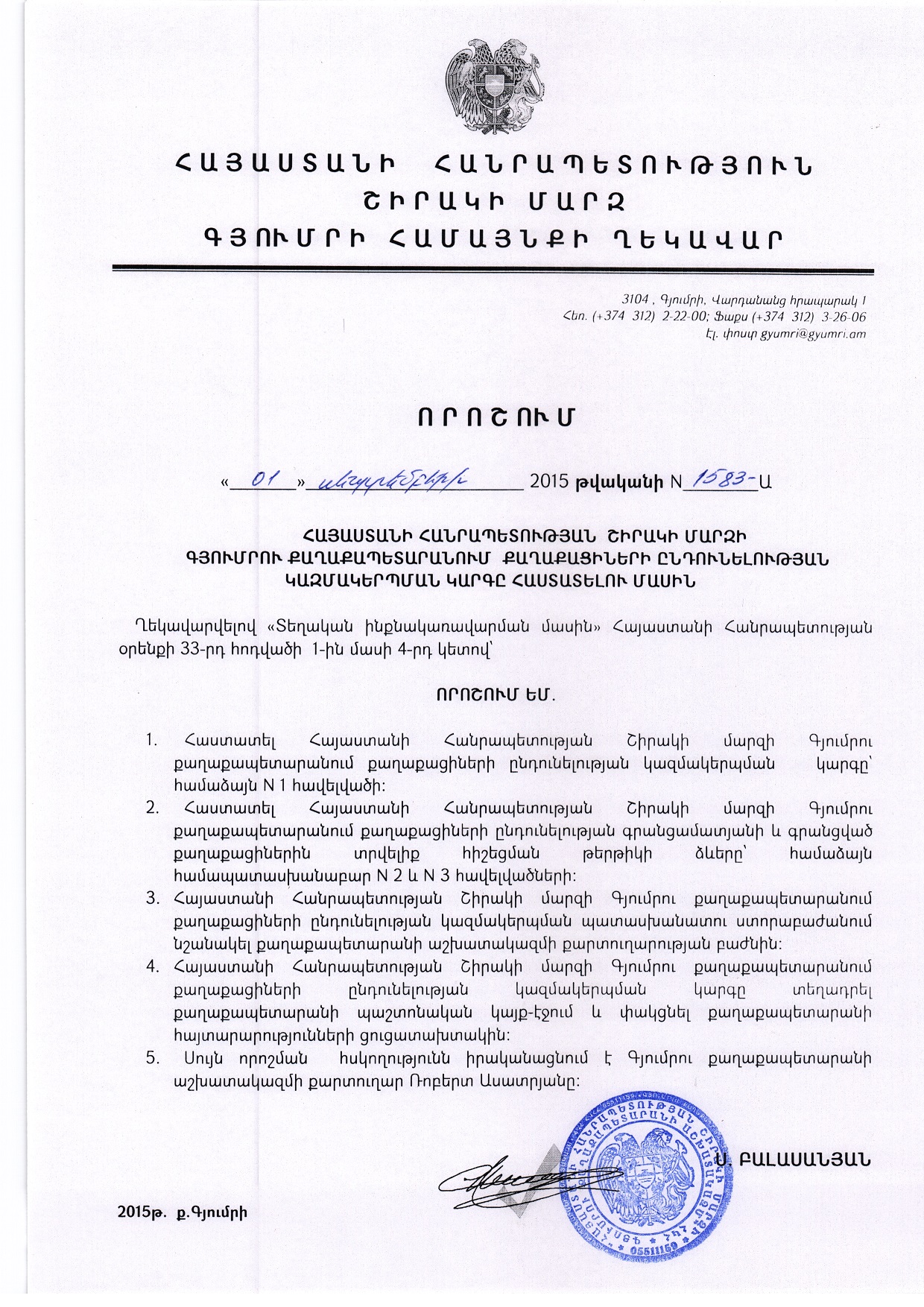 ՀՀ ՇԻՐԱԿԻ ՄԱՐԶԻ ԳՅՈՒՄՐԻ ՀԱՄԱՅՆՔԻ ՄՇԱԿՈՒՅԹԻ ԲՆԱԳԱՎԱՌԻ ՀԱՄԱՅՆՔԱՅԻՆ ՈՉ ԱՌԵՎՏՐԱՅԻՆ ԿԱԶՄԱԿԵՐՊՈՒԹՅՈՒՆՆԵՐԻ ՏՆՕՐԵՆՆԵՐԻ ԸՆՏՐՈՒԹԱՆ ՀԱՐՑԱԶՐՈՒՅՑԻ ԱՆՑԿԱՑՄԱՆ ՄԱՍԻՆ ՈՐՈՇՈՒՄ հավ. 1