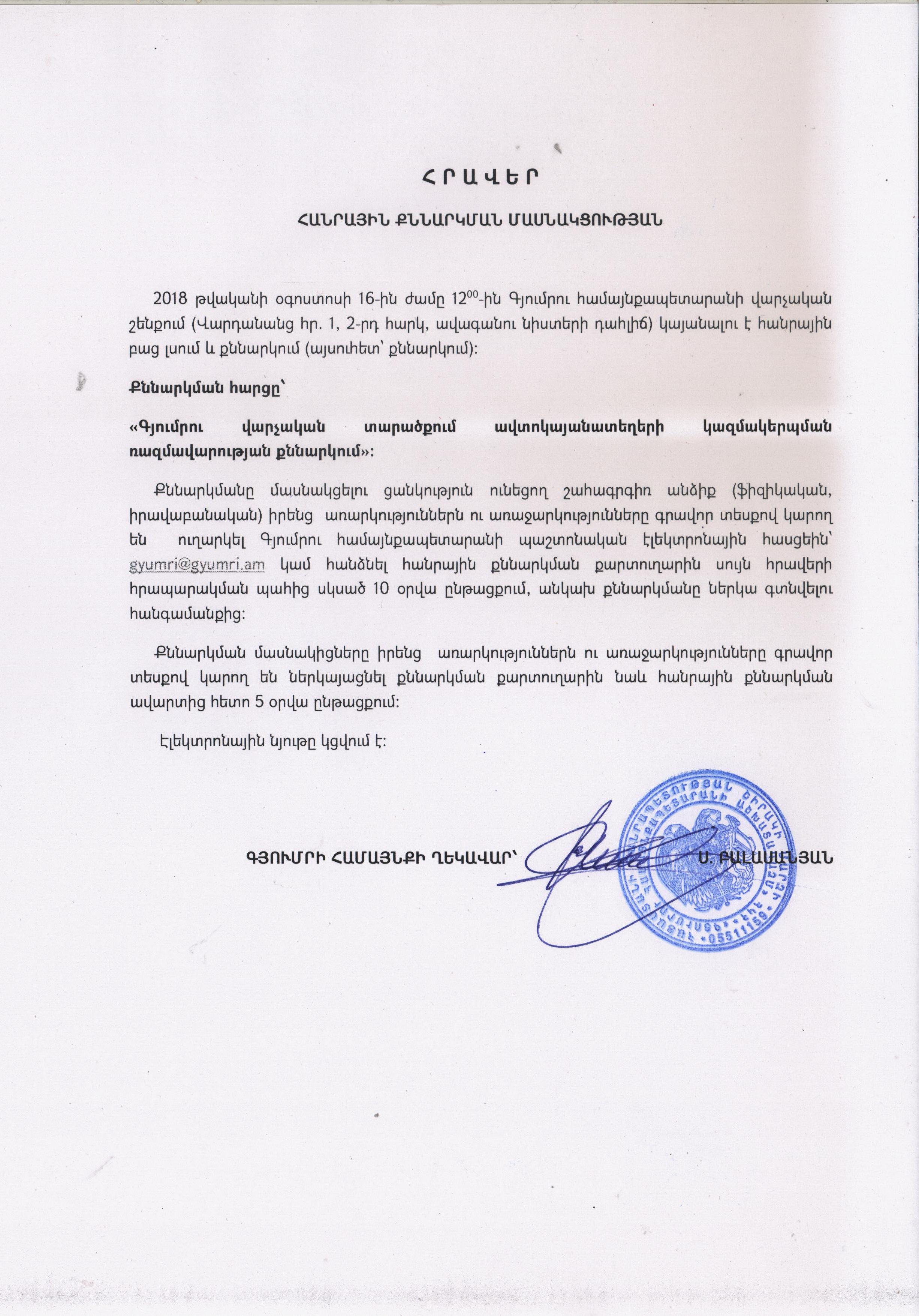 2018 թվականի օգոստոսի 16-ին ժամը 12:00-ին Գյումրու համայնքապետարանի վարչական շենքում (Վարդանանց հր. 1, 2-րդ հարկ, ավագանու նիստերի դահլիճ) կայանալու է հանրային բաց լսում և քննարկում (այսուհետ՝ քննարկում): Քննարկման հարցը՝ «Գյումրու վարչական տարածքում ավտոկայանատեղերի կազմակերպման ռազմավարության քննարկում»: