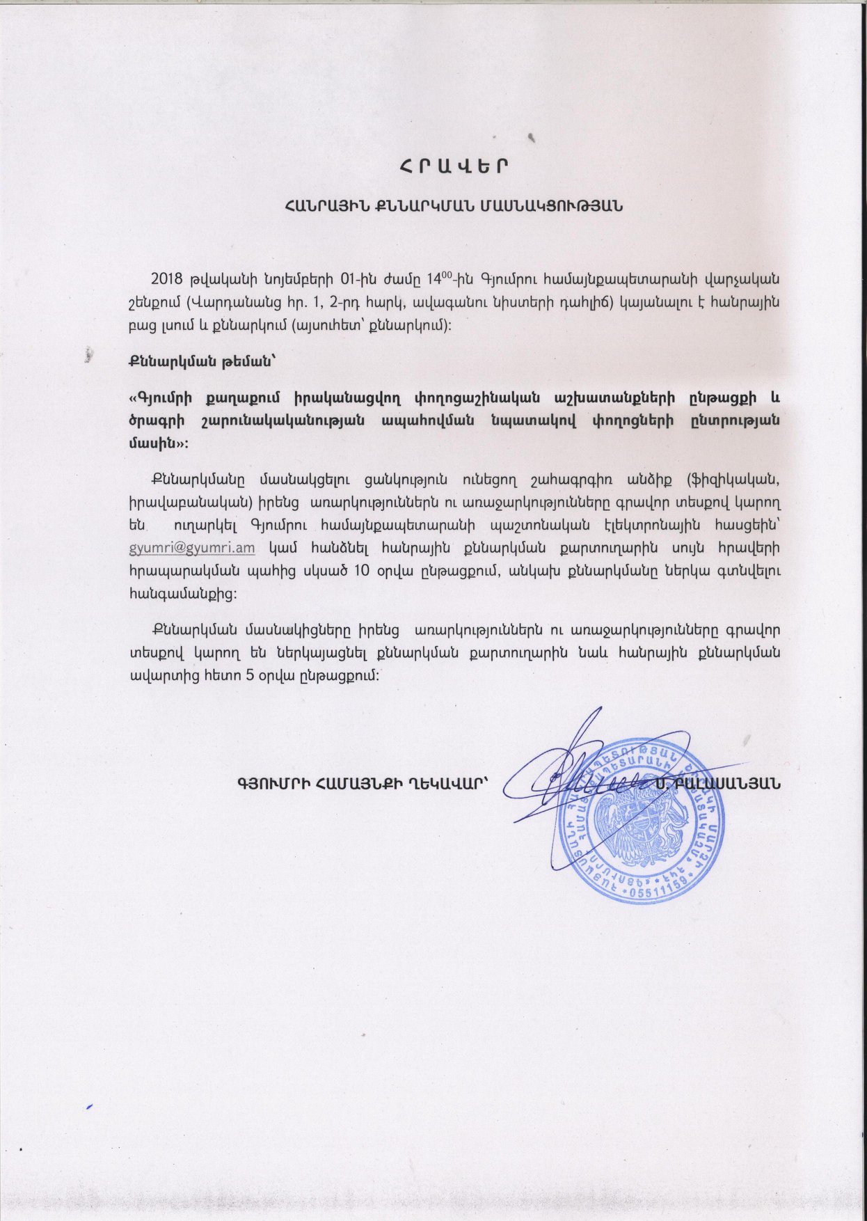 2018 թվականի նոյեմբերի 1-ին` ժամը 14:00-ին Գյումրու համայնքապետարանի վարչական շենքում(Վարդանանց հր. 1, 2-րդ հարկ, ավագանու նիստերի դահլիճ) կայանալու է հանրային բաց լսում և քննարկում (այսուհետ՝ քննարկում):