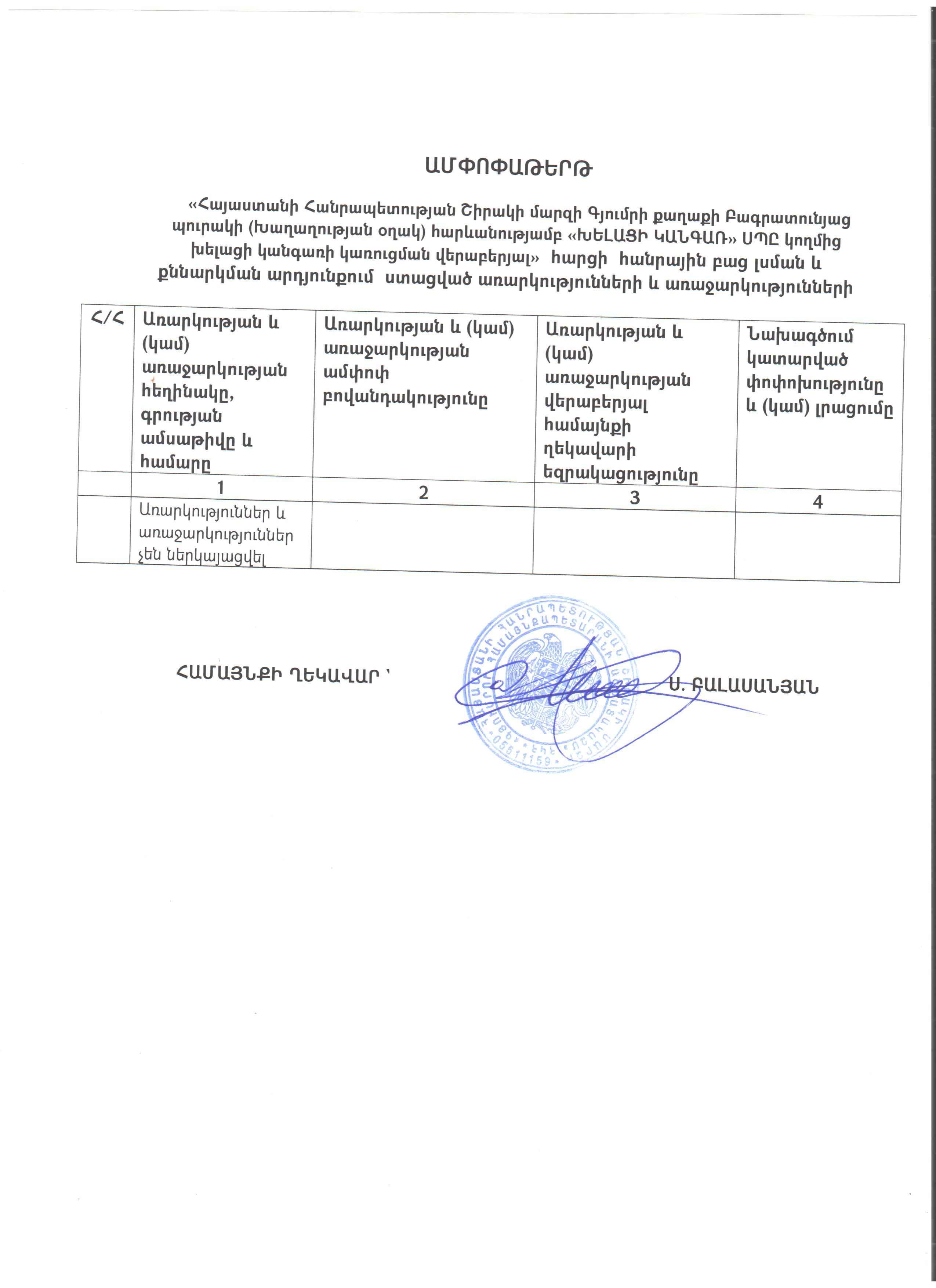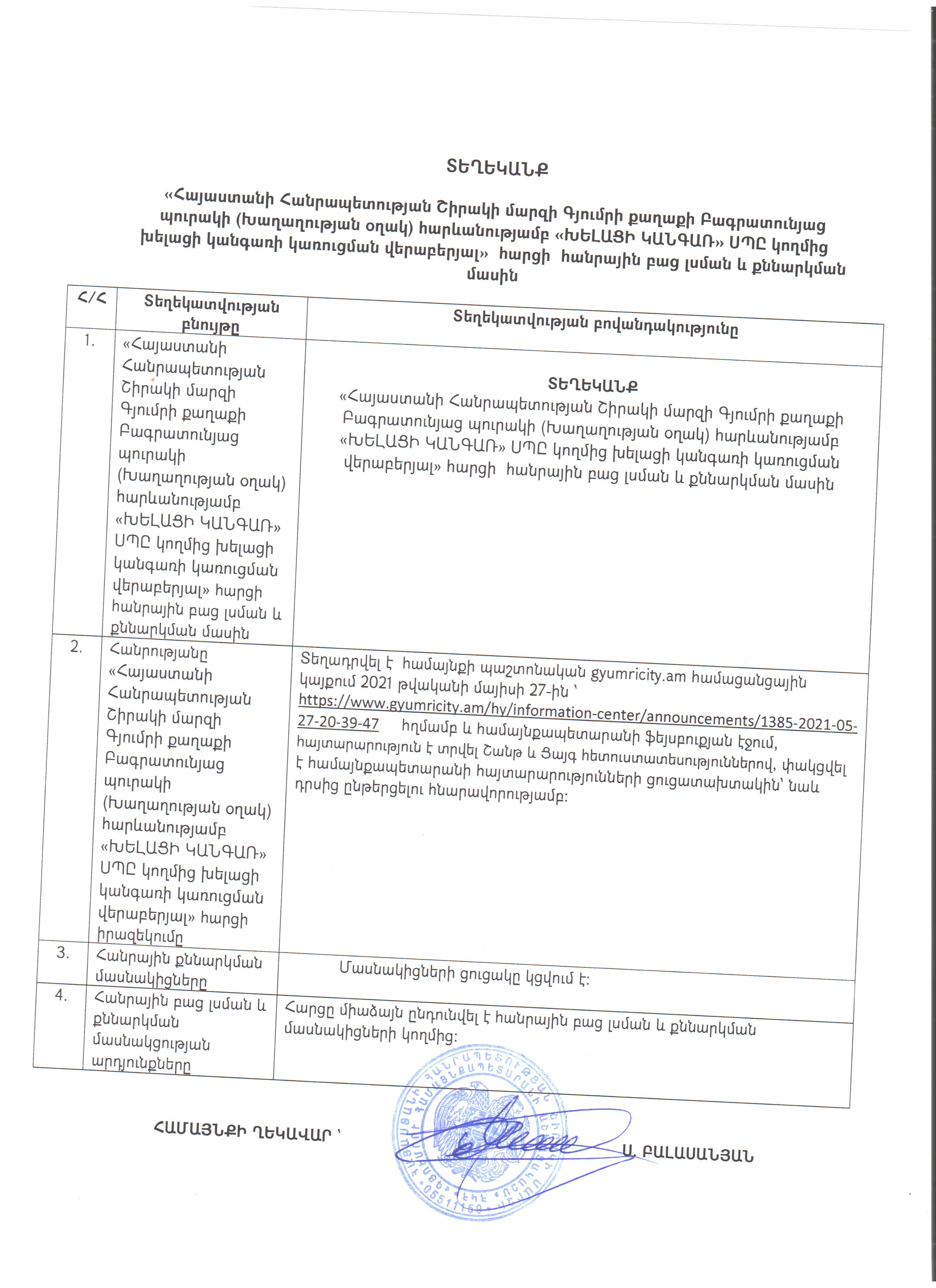 «Հայաստանի Հանրապետության Շիրակի մարզի Գյումրի քաղաքի Բագրատունյաց պուրակի (Խաղաղության օղակ) հարևանությամբ «ԽԵԼԱՑԻ ԿԱՆԳԱՌ» ՍՊԸ կողմից խելացի կանգառի կառուցման վերաբերյալ» հարցի հանրային բաց լսման և քննարկման