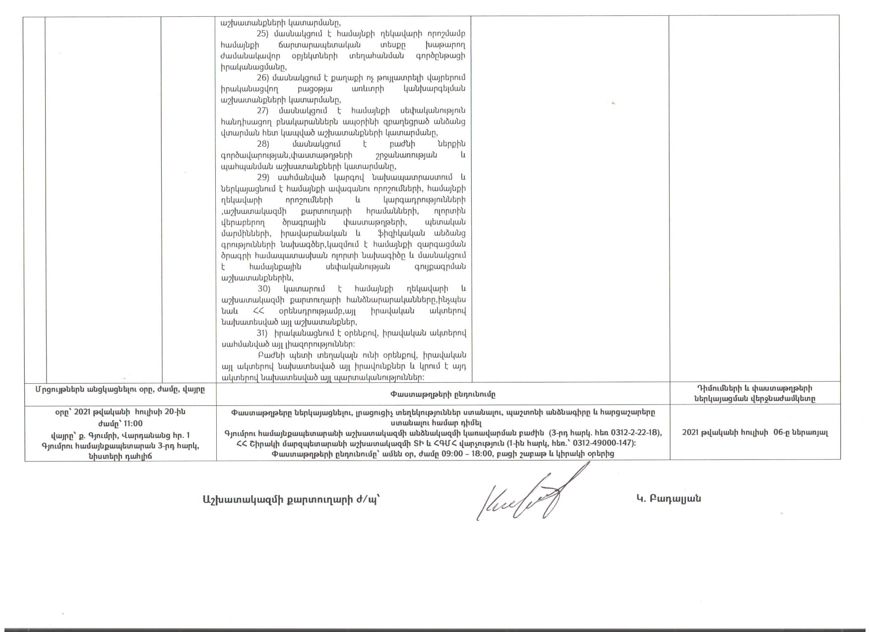 Գյումրու համայնքապետարանը հայտարարում է մրցույթ՝ Գյումրու համայնքապետարանի աշխատակազմի անշարժ գույքի կառավարման բաժնի պետի տեղակալի թափուր պաշտոնի համար: Մանրամասներին ծանոթանալ կից ներկայացված փաստաթղթերում: