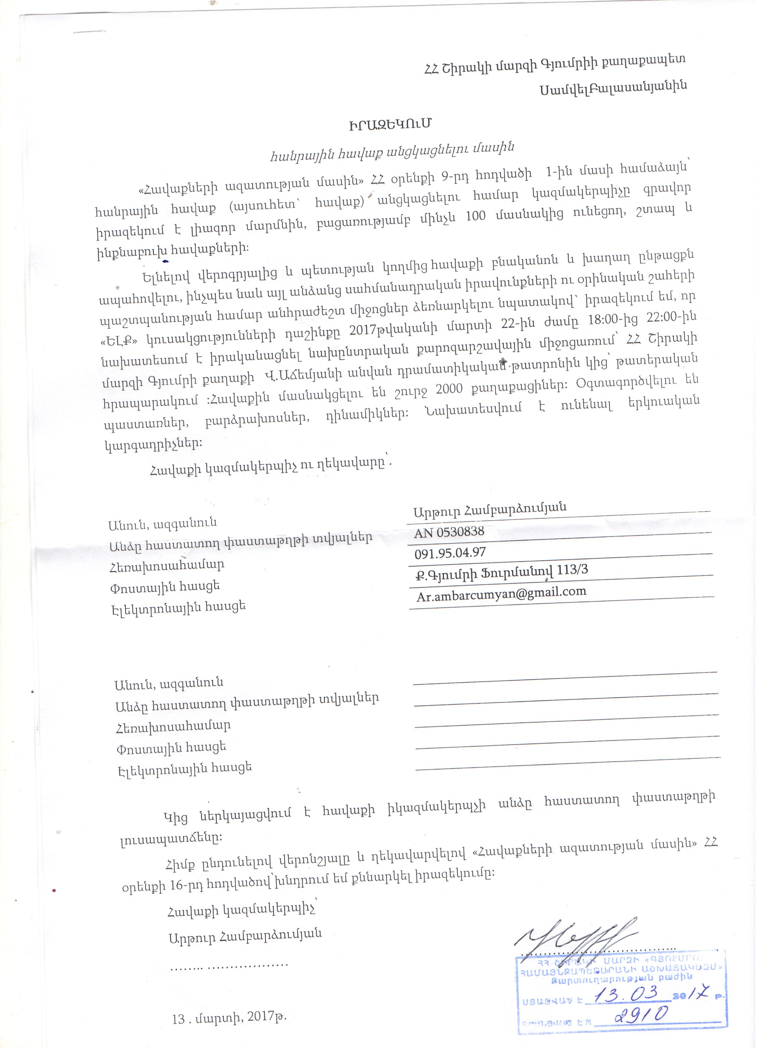 <<Ելք >> կուսակացությունների դաշինքի կողմից մարտի 22 -ին հանրային հավաք անցկացնելու մասին իրազեկում