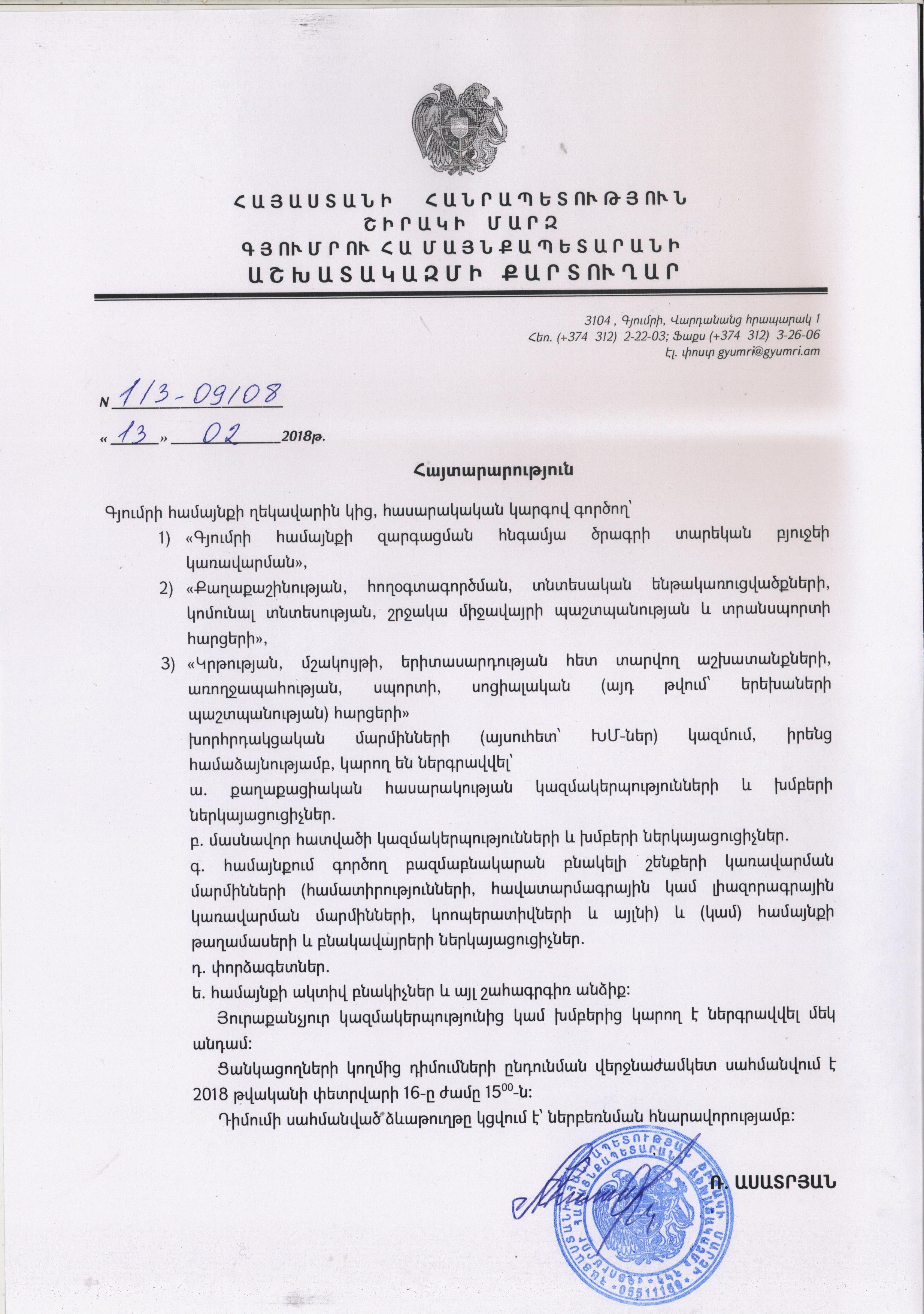 Գյումրի համայնքի ղեկավարին կից, հասարակական կարգով գործող ԽՄ-ների կազմում, որպես անդամ, ընդգրկվելու մասին: