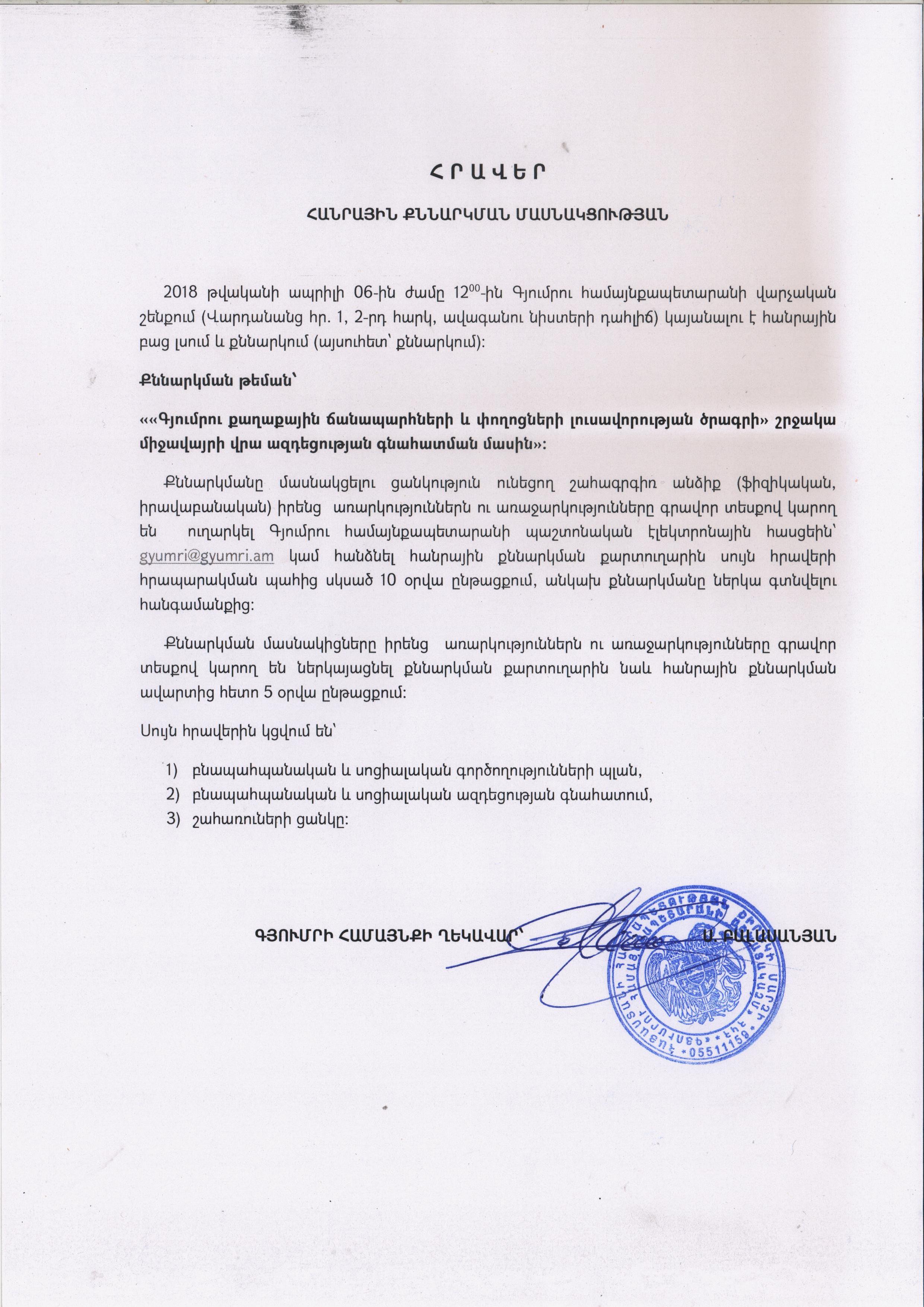 «Շրջակա միջավայրի վրա ազդեցության գնահատման և փորձաքննության մասին» ՀՀ օրենքի /21.06.2014թ. Հ0-110-Ն/, ինչպես նաև ՀՀ կառավարության 19.11.2014թ. N1325-Ն որոշմամբ սահմանված կարգով 2018 թվականի ապրիլի 6-ին ժամը 12:00-ին Գյումրու համայնքապետարանի դահլիճում տեղի կունենա Վերակառուցման և Զարգացման Եվրոպական Բանկի ֆինանսավորմամբ իրականացվող «Գյումրու քաղաքային ճանապարհների և փողոցների լուսավորության ծրագրի» շրջակա միջավայրի վրա ազդեցության գնահատման հանրային քննարկում: