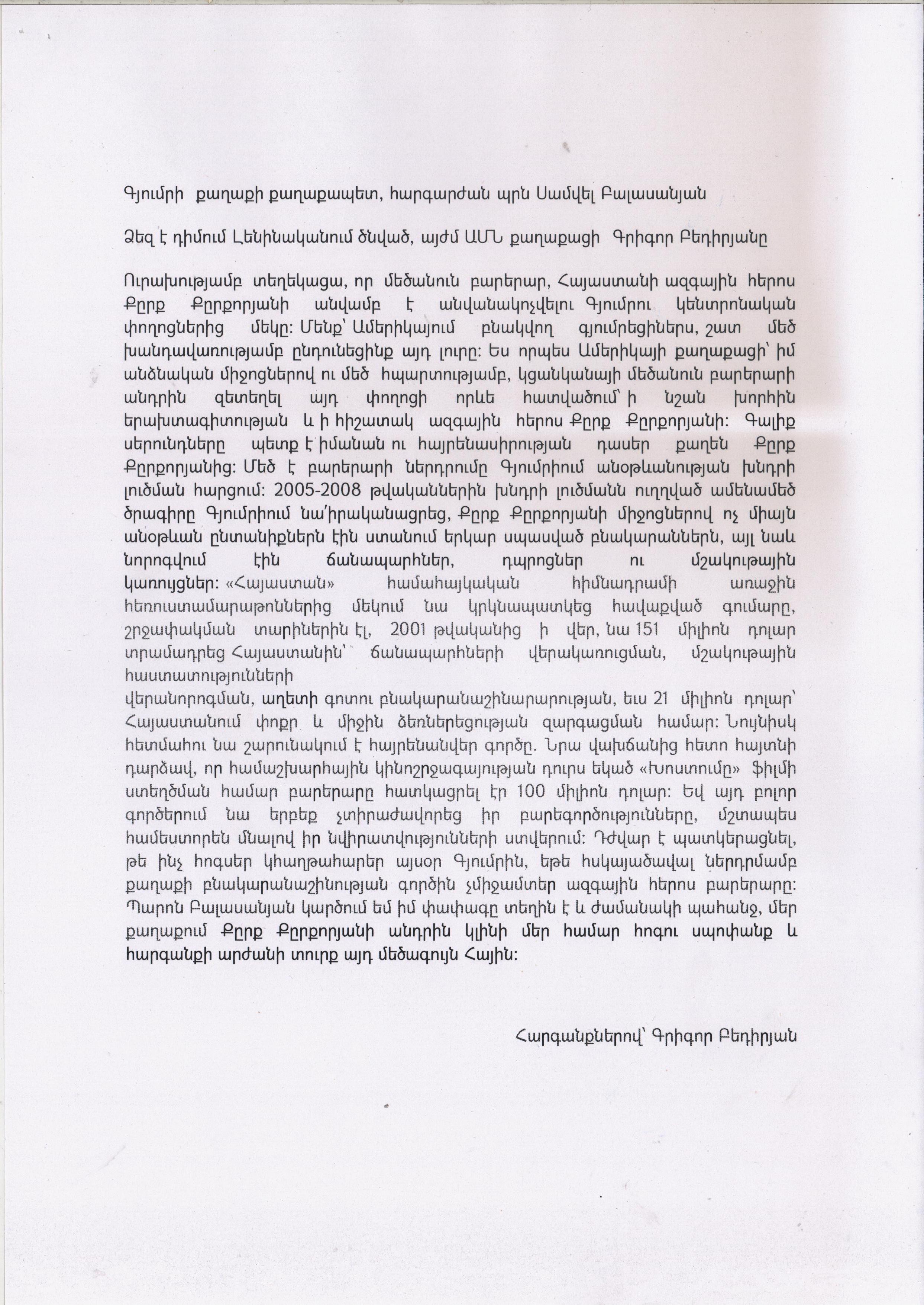 «ՀՀ Շիրակի մարզի Գյումրի քաղաքի Աբովյան (Քըրք Քըրքորյանի) փողոցում Հայաստանի ազգային հերոս Քըրք Քըրքորյանի արձանը տեղադրելու մասին»: