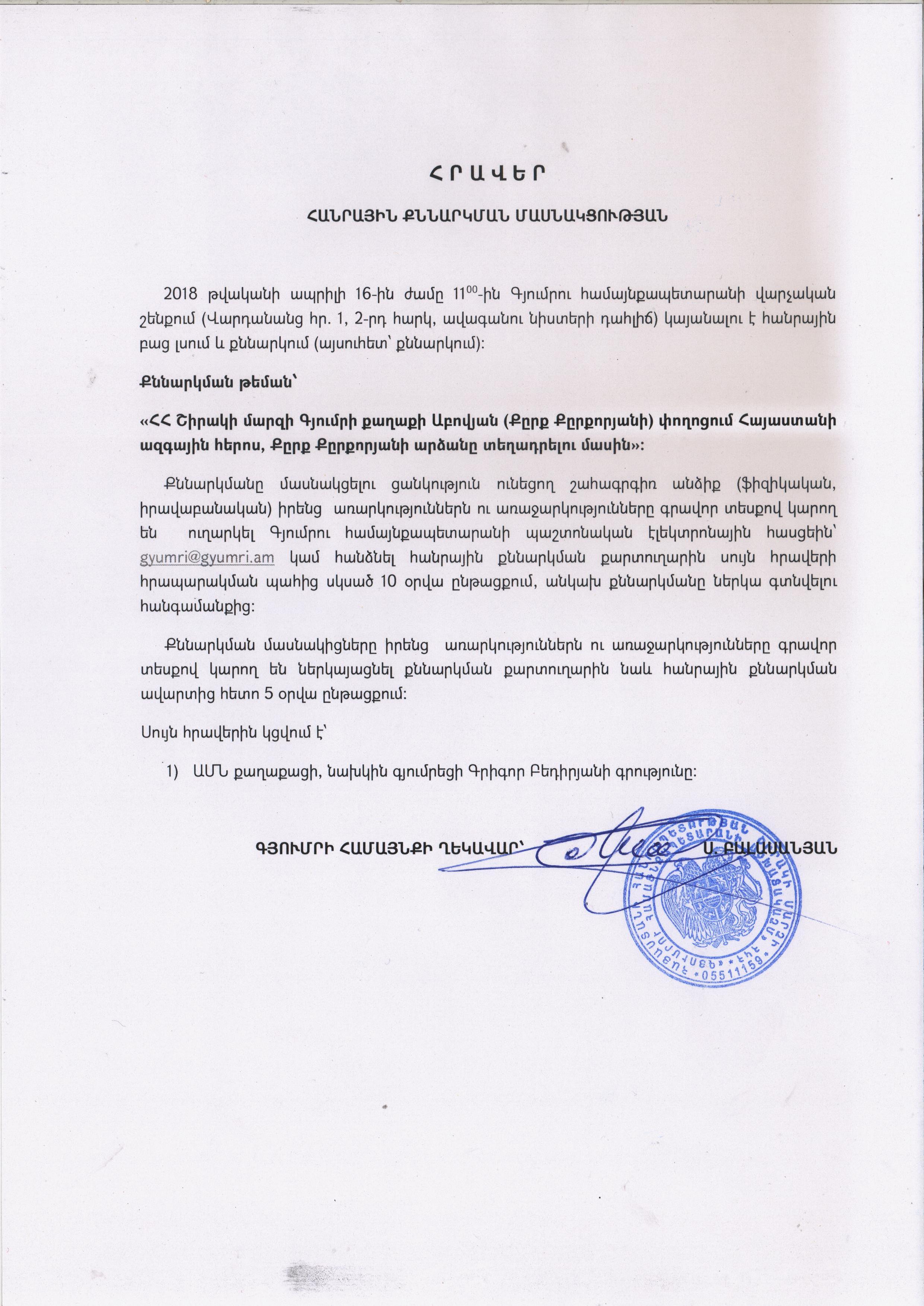 2018 թվականի ապրիլի 16-ին` ժամը 11:00-ին, Գյումրու համայնքապետարանի վարչական շենքում (Վարդանանց հր. 1,2-րդ հարկ, ավագանու նիստերի դահլիճ) կայանալու է հանրային բաց լսում և քննարկում: