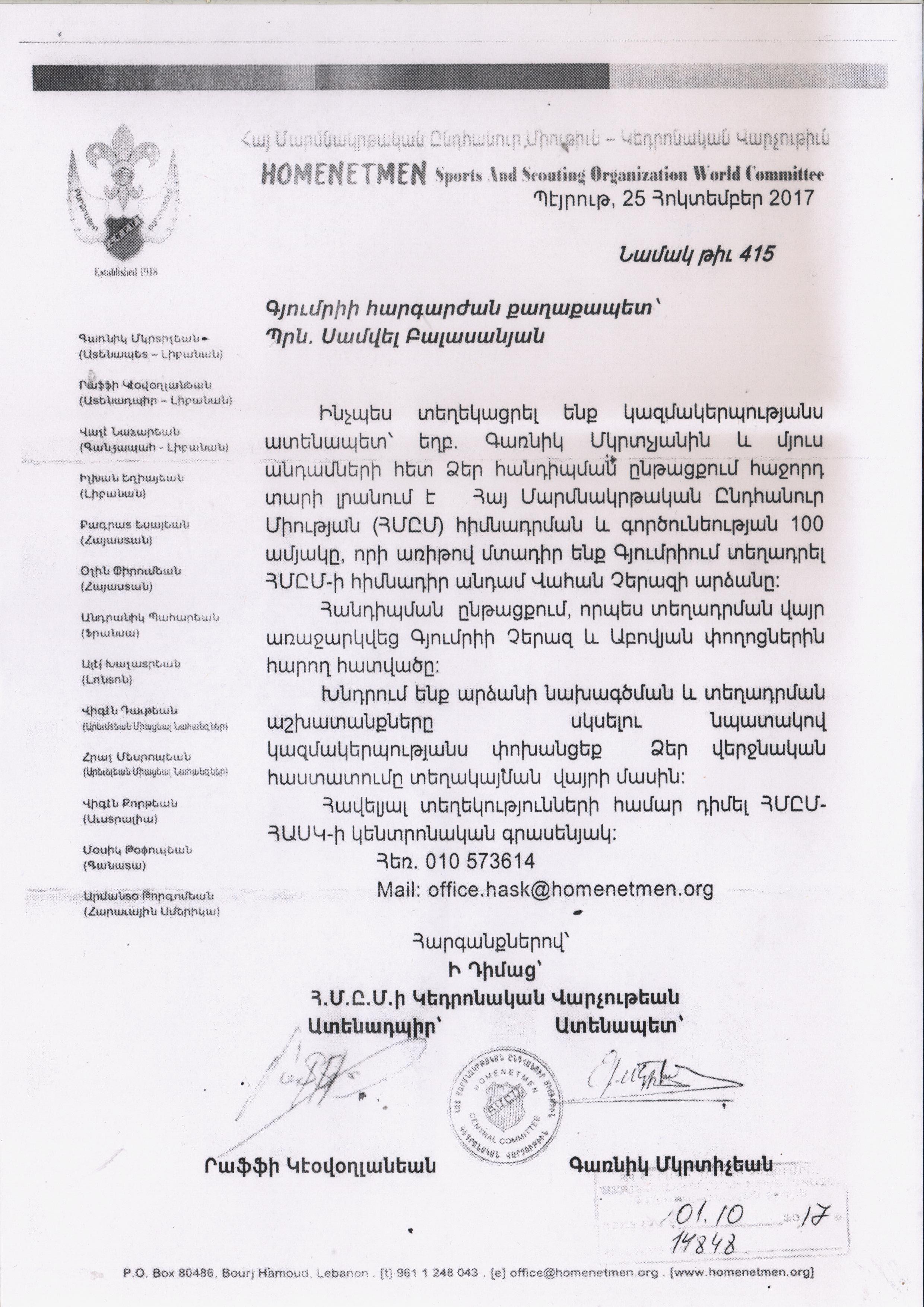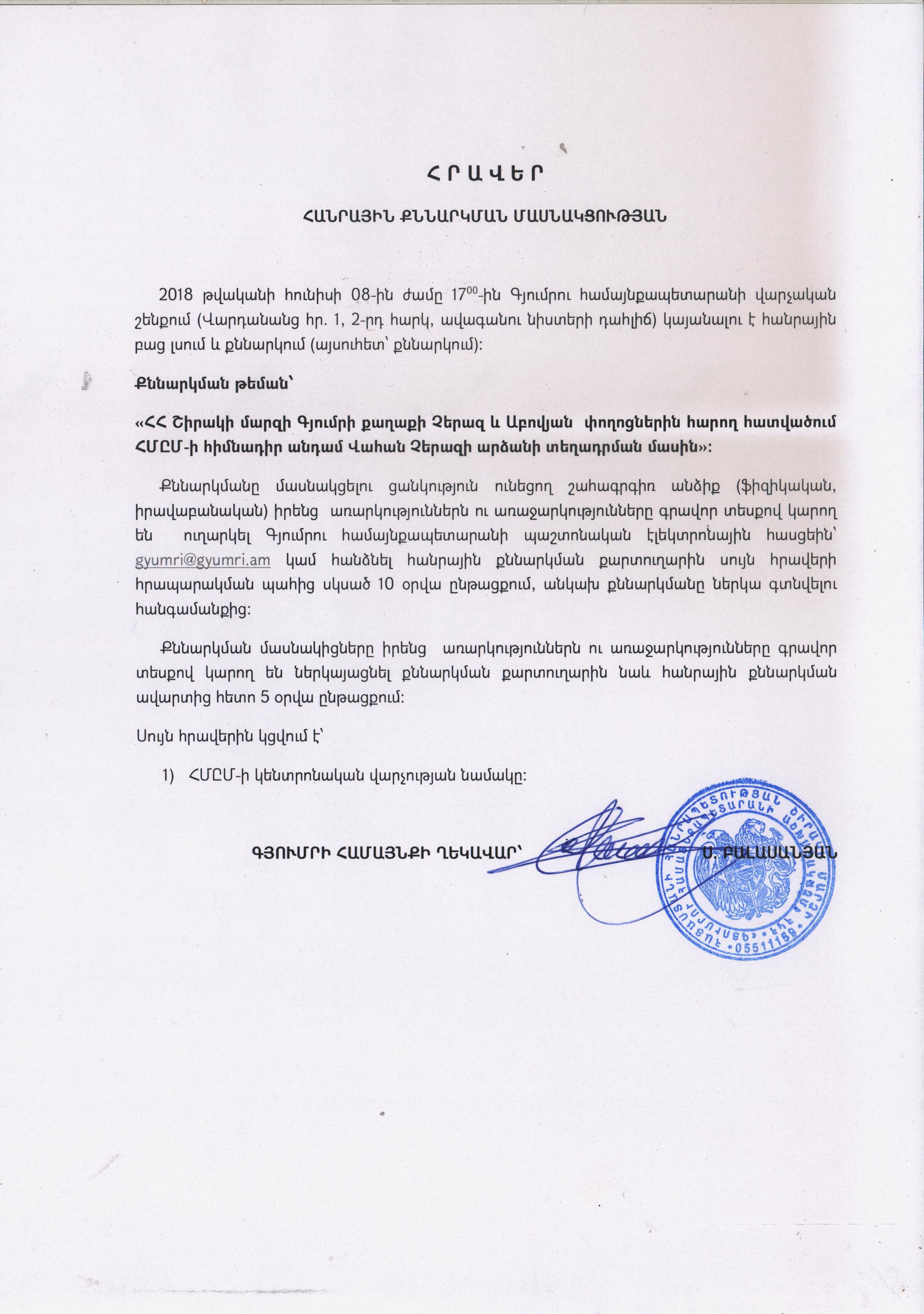 2018 թվականի հունիսի 08-ին ժամը 1700-ին Գյումրու համայնքապետարանի վարչական շենքում (Վարդանանց հր. 1, 2-րդ հարկ, ավագանու նիստերի դահլիճ) կայանալու է հանրային բաց լսում և քննարկում (այսուհետ՝ քննարկում): Քննարկման թեման՝ «ՀՀ Շիրակի մարզի Գյումրի քաղաքի Չերազ և Աբովյան փողոցներին հարող հատվածում ՀՄԸՄ-ի հիմնադիր անդամ Վահան Չերազի արձանի տեղադրման մասին»: