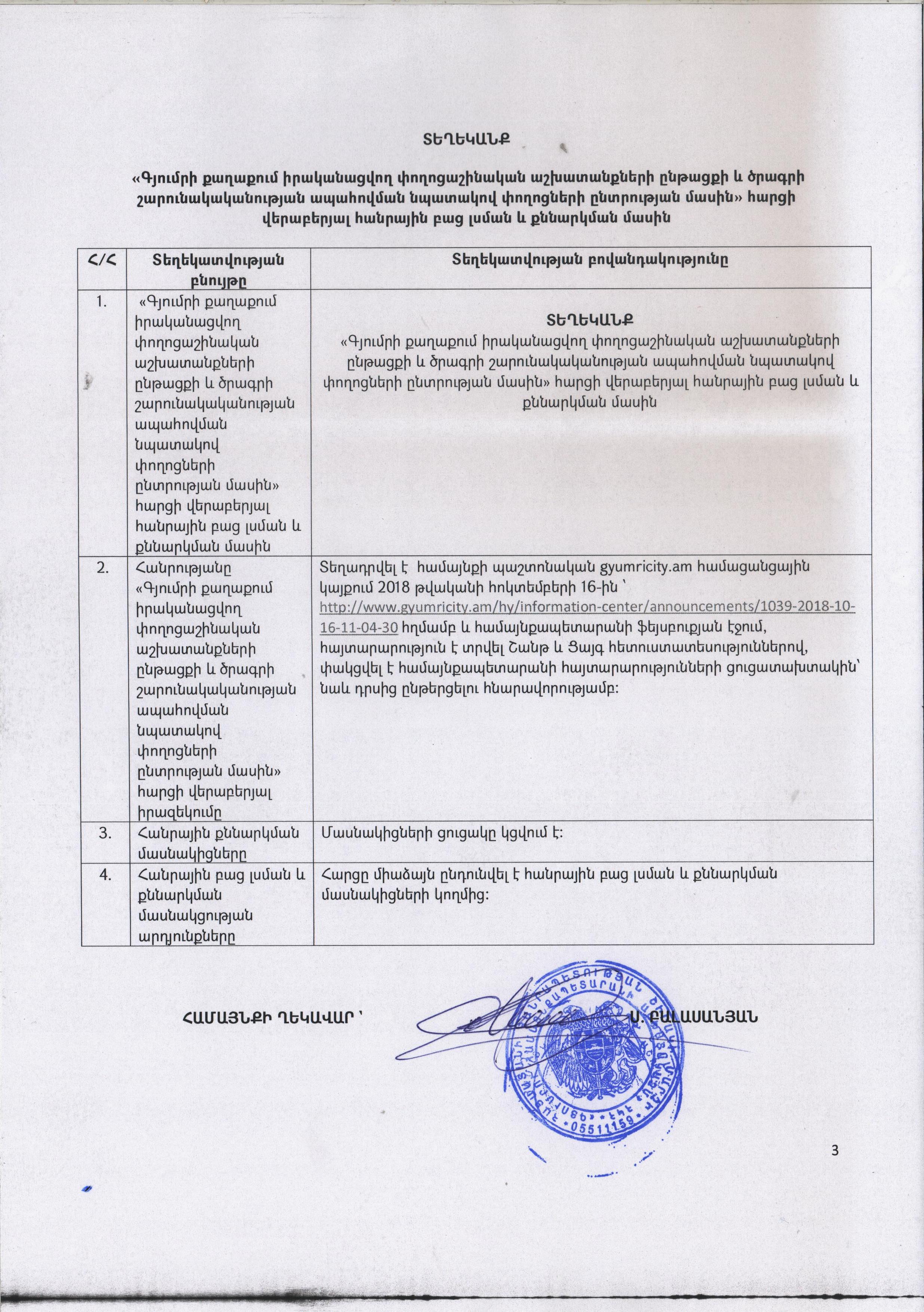 «Գյումրի քաղաքում իրականացվող փողոցաշինական աշխատանքների ընթացքի և ծրագրի շարունակականության ապահովման նպատակով փողոցների ընտրության մասին»հարցի վերաբերյալ հանրային բաց լսման և քննարկման