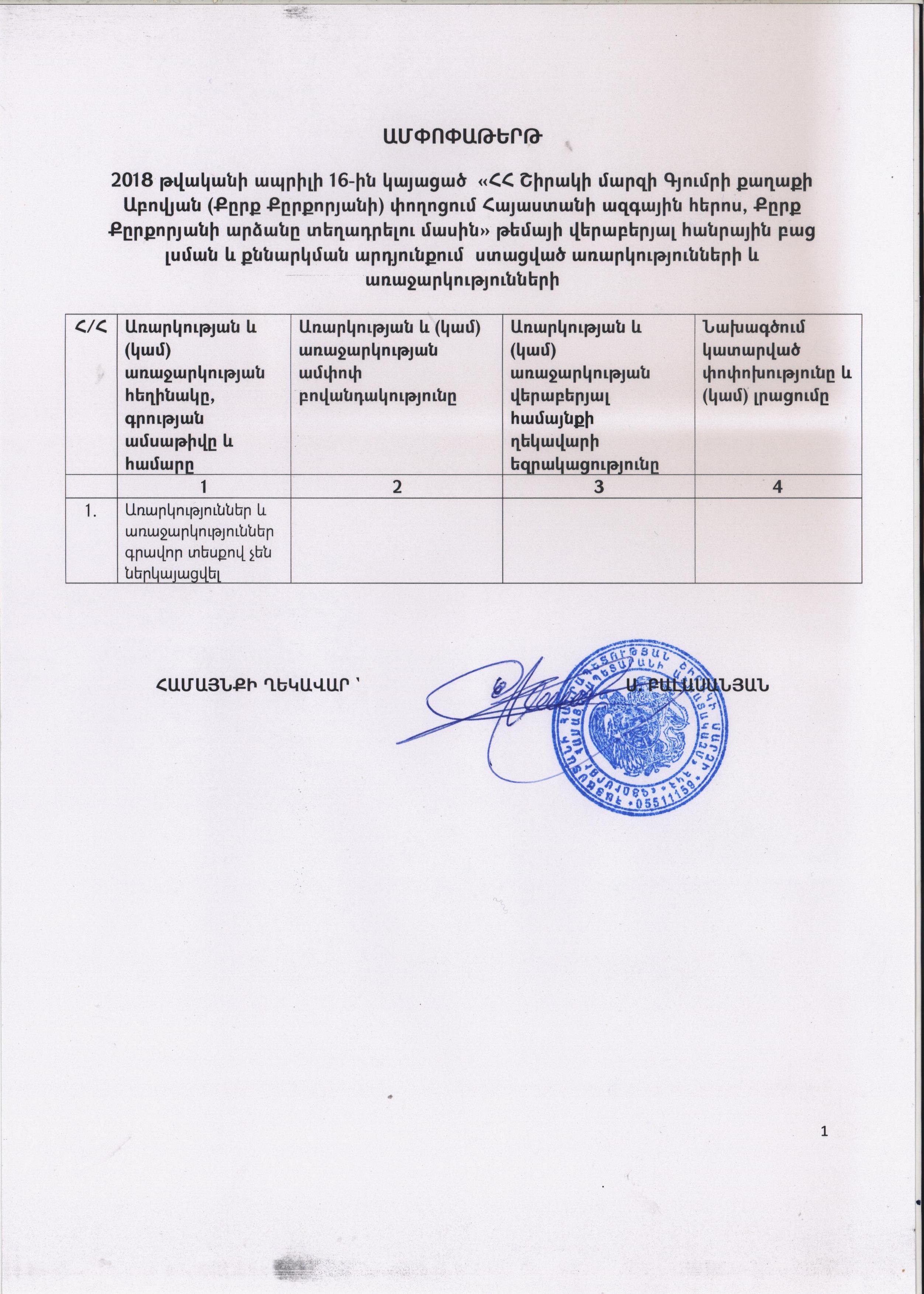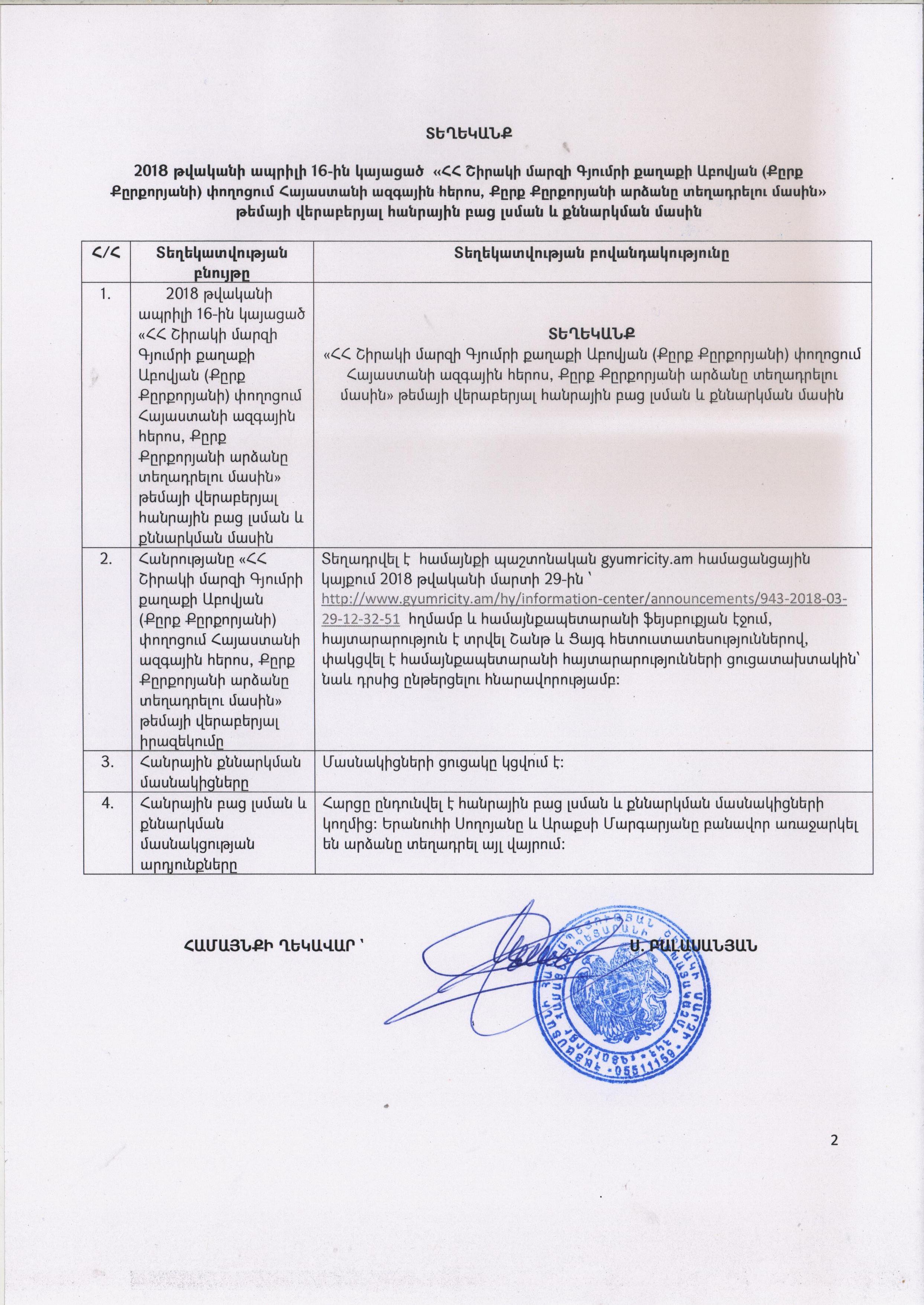 «ՀՀ Շիրակի մարզի Գյումրի քաղաքի Աբովյան (Քըրք Քըրքորյանի) փողոցում Հայաստանի ազգային հերոս Քըրք Քըրքորյանի արձանը տեղադրելու մասին» հանրային բաց լսման և քննարկման: