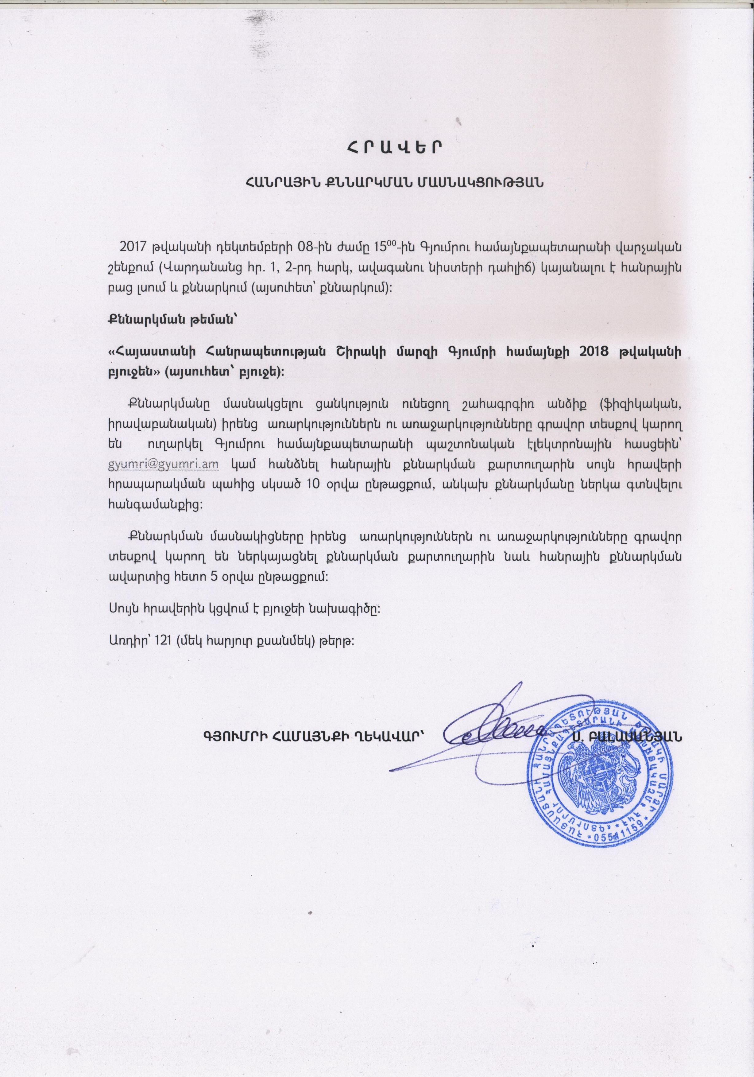 Հայաստանի Հանրապետության Շիրակի մարզի Գյումրու համայնքապետարանի վարչական չենքում 2017 թվականի հոկտեմբերի 25-ին կայացած հանրային բաց լսման,քննարկման վերաբերյալ